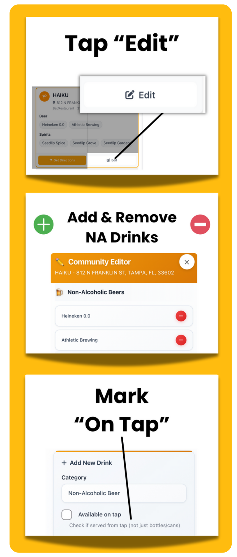 Every venue now has an “Edit” button. Add or remove non-alcoholic beer, wine, spirits and mocktails directly within the results. No account needed. Available to all users, free and premium.
